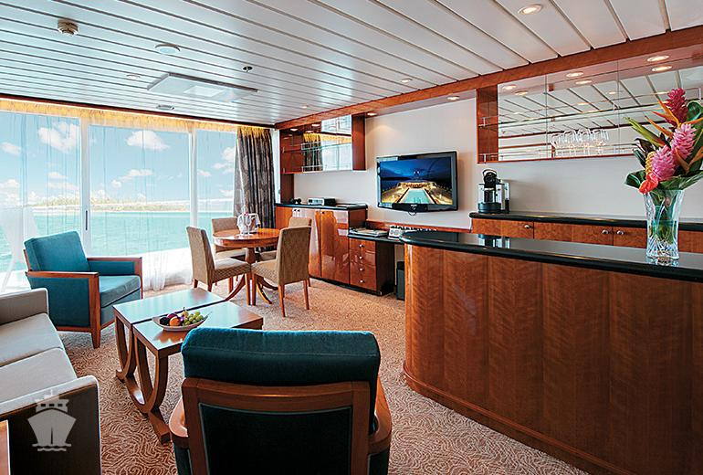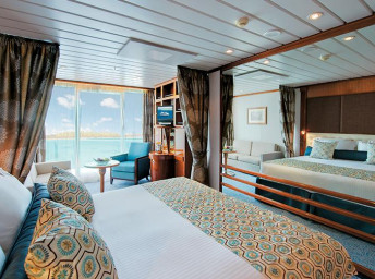 | 2 x GS Grand Suite: Paul Gauguin Suite (801), Flora Tristan Suite (802). Velikost 49m² = Kajuta: 31m² / Veranda: 18m² Max obsazenost 3 osoby. Internet a Butler servis v ceně. | ![]() |