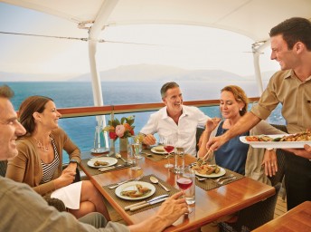 Každá loď nabízí výběr stravovacích zařízení, ze kterých si může host vybrat podle své momentální nálady. Téměř všechny mají otevřeno sezení. Všechna jídla jsou bez příplatku a k obědu a večeři se bezplatně nalévají kvalitní vína.