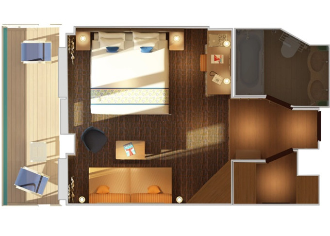 | OS - Ocean Suite 100 - 108 m² (kajuta a balkón). 2 koupelny, vířivka, šatník. Služby Suite. | 52 297 Kč 26 149 Kč za osobu | ||
