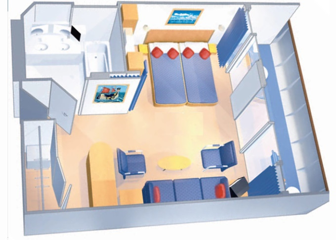 | 1K - Velká vnější kajuta Ultra Spacious 24,5 m². Neotevíratelné okno. 7/8. paluba. Max. 6 osob. | 82 086 Kč 82 086 Kč za osobu | ||