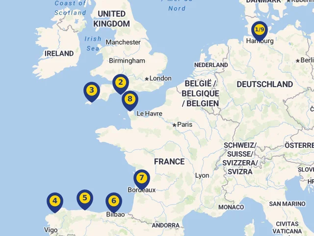 Poznejte místa, kde Vaše loď během plavby zakotví! Každá zastávka je označena číslem, které odpovídá její pozici na mapě, abyste mohli snadno sledovat celou trasu. Stačí kliknout na vybranou destinaci a zjistíte více o každé z nich. Pro lepší přehled si můžete celý program plavby prohlédnout přímo na mapě.