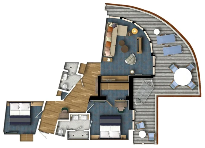 | SPNO - Panorama Suite 73-77 m² + balkon 31-36 m² se stolem, lehátky a houpací sítí. 2 ložnice a 2 koupelny. 6,9,10. paluba. Max 6 osoby. Výhody Suite. | 489 319 Kč 244 660 Kč za osobu | ||