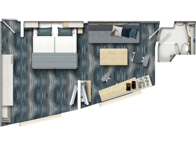 | SUHO - Himmel & Meer Suite 42 m² + prekrytá terasa 29 m² v patře se stolem, lehátky a s houpací sítí. Ložnice s obývací částí a jedálenským kútom. 14. paluba. Max 4 osoby. Výhody Suite. | 449 198 Kč 112 300 Kč za osobu | ||