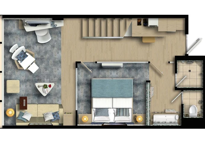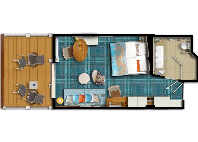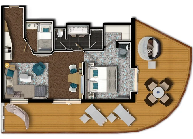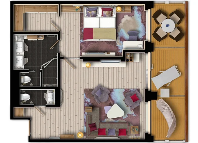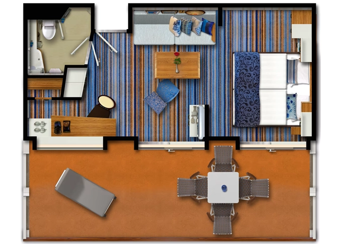 | SUTO - Themen Suite 54 m² + balkon 15 m² se stolem, lehátkom a houpací sítí. Ložnice, Obývací část, šatník. 10. paluba. Max 4 osoby. Výhody Suite. | 354 330 Kč 177 165 Kč za osobu | ||